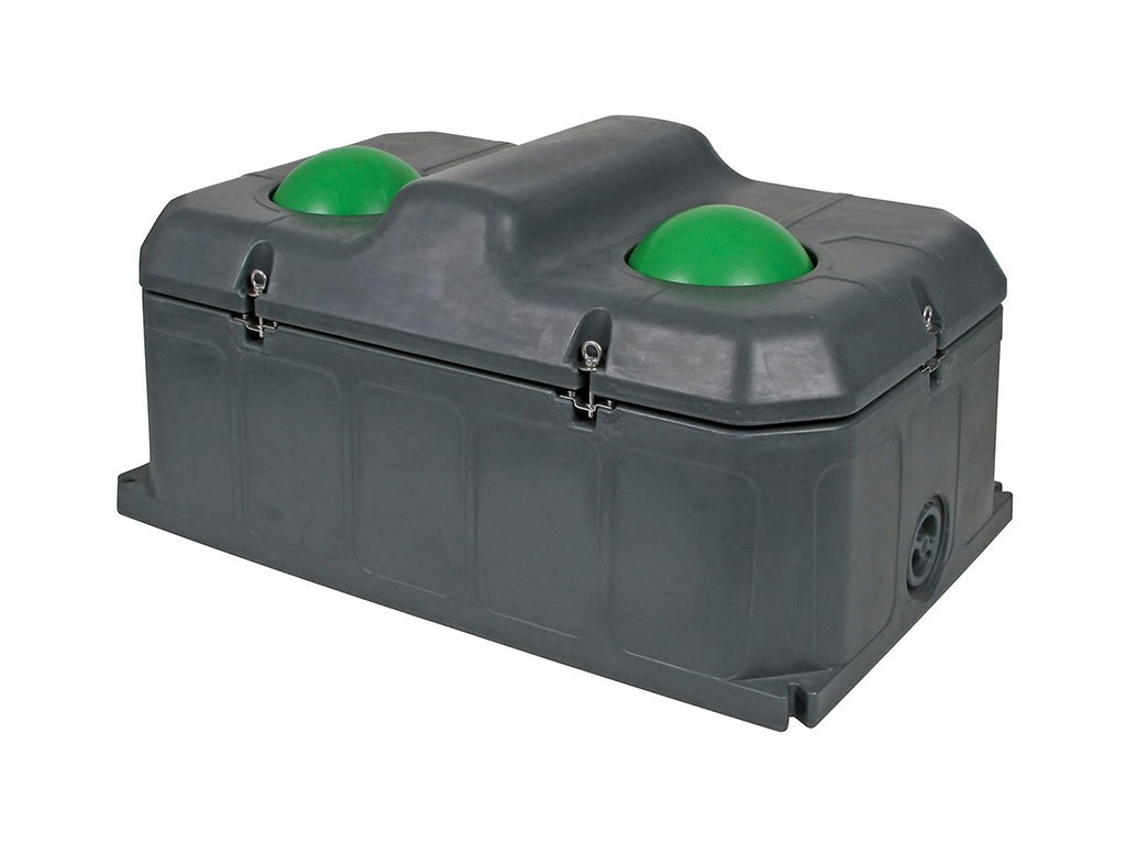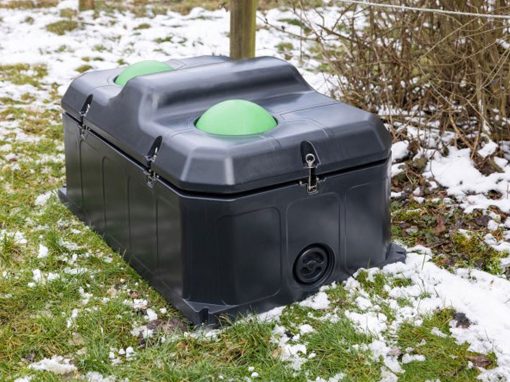 Adăpător cu bilă pentru bovine și cabaline, cu două locuri , cu un volum de 100 litri, pentru 20 - 30 de animale, rezistent la îngheț cu izolație dublă, temperatura apei iarna aprox. 3 - 5°C, temperatura apei vara aprox. 10 - 12°C, orificiu de scurgere Ø100 mm, nu necesită conectare la rețeaua electrică, dimensiuni 108,5x70x52,5 cm.