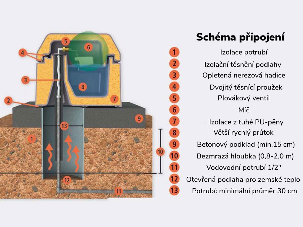 Recomandăm instalarea alimentatorului cu bile conform instrucțiunilor, ceea ce va asigura funcționalitatea corectă a alimentatorului atât în lunile de iarnă, cât și în cele de vară. Acest alimentator cu bile este proiectat astfel încât să nu necesite conectare la rețeaua electrică. Temperatura apei este menținută peste zero grade prin curgerea apei prin țevi, prin căldura geotermală și prin izolația dublă din spumă a alimentatorului.