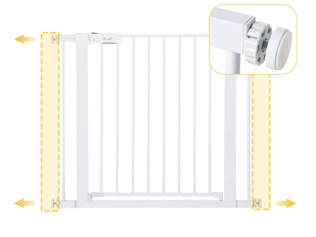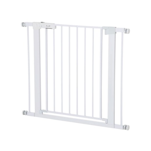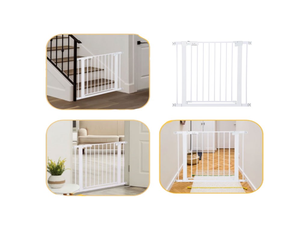 Poarta de siguranță pentru câini este fabricată dintr-un cadru robust din oțel, cu un finisaj elegant alb, care se integrează ușor în orice interior. Balamalele și punctele de fixare pe perete sunt fabricate din plastic durabil, asigurând rezistență și durabilitate. Distanța dintre barele porții este de 5,7 cm , ceea ce este ideal pentru a preveni trecerea câinilor mai mici și pentru a menține o ventilație suficientă. Ușile sunt la o distanță de 5,5 cm de cadru, ceea ce permite deschiderea și închiderea ușoară , fără a se bloca. Pentru spații de peste 82 cm, recomandăm utilizarea unor extensii suplimentare pentru a asigura o fixare stabilă a porții. Dimensiunile totale ale porții variază de la 75 la 96 cm în lățime și 76 cm în înălțime, ceea ce permite adaptarea acesteia la diferite spații din casa dumneavoastră.