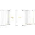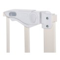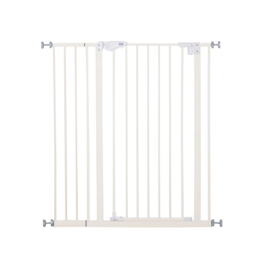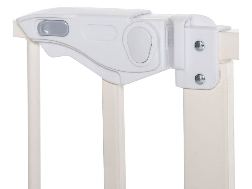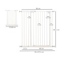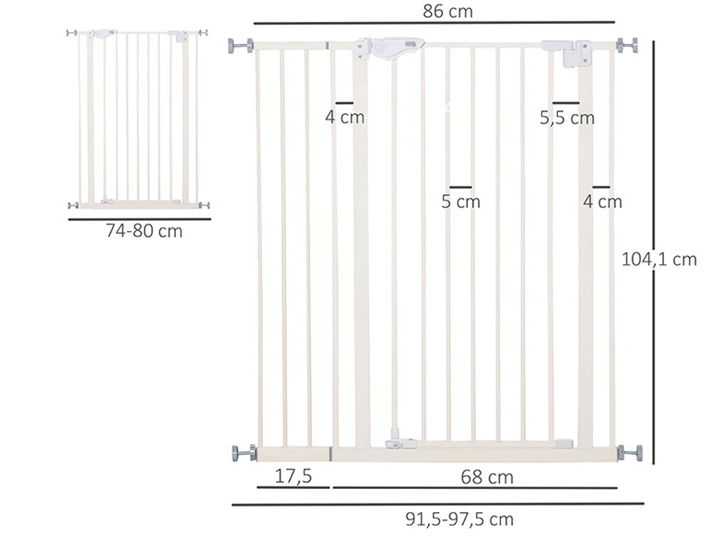 Poarta de siguranță pentru câini este fabricată dintr-un cadru robust din oțel, cu un finisaj elegant alb, care se integrează ușor în orice interior. Balamalele și punctele de fixare pe perete sunt fabricate din plastic durabil, asigurând rezistență și durabilitate. Distanța dintre barele porții este de 5,7 cm , ceea ce este ideal pentru a preveni trecerea câinilor mai mici și pentru a menține o ventilație suficientă. Ușile sunt la o distanță de 5,5 cm de cadru, ceea ce permite deschiderea și închiderea ușoară , fără a se bloca. Pentru spații de peste 82 cm, recomandăm utilizarea unor extensii suplimentare pentru a asigura o fixare stabilă a porții. Dimensiunile totale ale porții variază de la 74 la 97,5 cm în lățime și 104 cm în înălțime, ceea ce permite adaptarea acesteia la diferite spații din casa dumneavoastră.