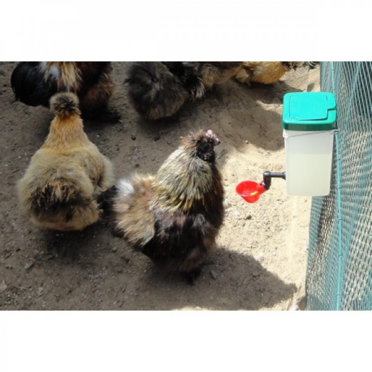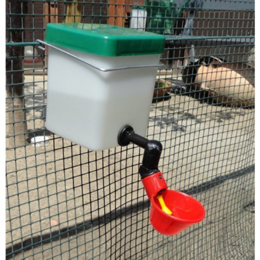 Adăpătoare cu bol roșu și suport din plasă. Potrivită pentru păsări de curte.