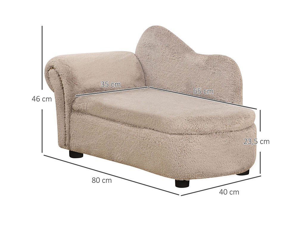 Canapea pentru câini de până la 10 kg, husă din material textil moale , cadru rezistent din lemn de eucalipt, spațiu de depozitare sub șezut, dimensiuni șezut 65x35x23,5 cm , dimensiuni totale 80x40x46 cm .