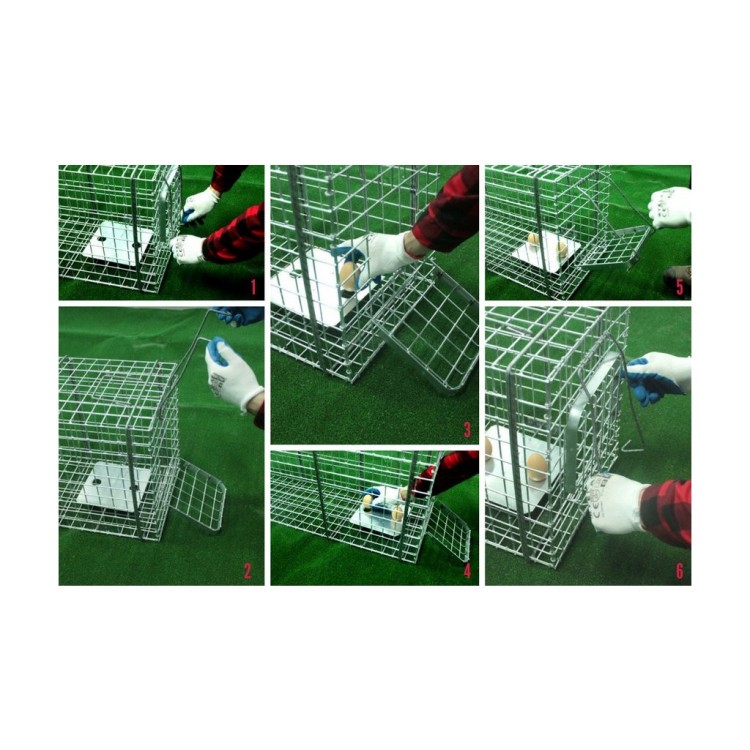 5. Capcanele se montează prin ridicarea intrărilor capcanelor după plasarea momelii pe suprafața de declanșare. Acestea se fixează folosind tija superioară, conectând și fixând tijele astfel încât capcana să rămână deschisă. Când vânatul intră în cușcă și calcă pe mecanismul de declanșare, tijele sunt eliberate și capcana se închide. Unii utilizatori preferă să plaseze momeala după ce au montat capcana, această decizie aparține dumneavoastră.