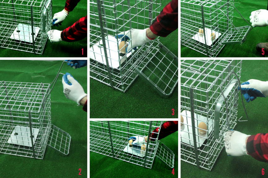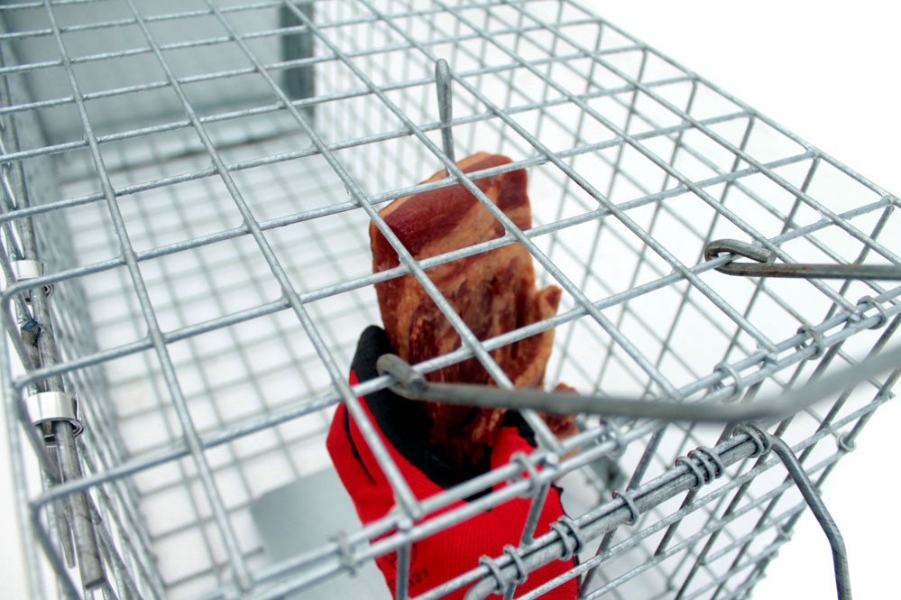 - Momeala se plasează la celălalt capăt al capcanei, de la intrarea în cușca de capcană.