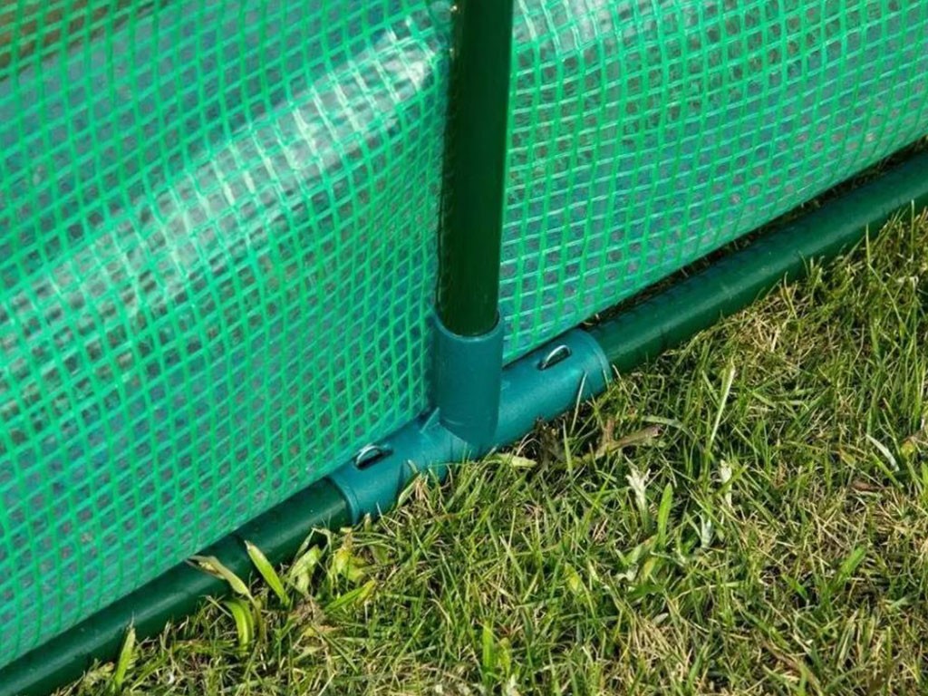 Prelata verde practică a serei este fabricată din pânză de polietilenă cu fibre de sticlă cu o permeabilitate de 140g/m2. Structura serei este alcătuită din tije metalice cu diametrul de 25 mm. Asamblarea este foarte ușoară și rapidă, structurile se îmbină pur și simplu cu un clic, prelata se întinde și se atașează de aceasta, iar întreaga seră este ancorată de sol. Pentru a asigura ventilația, sera are 6 ferestre de ventilație care pot fi închise sau deschise după cum este necesar și legate cu șireturi. Ușa spațioasă a serei poate fi rulată și legată în partea de sus cu șireturi.