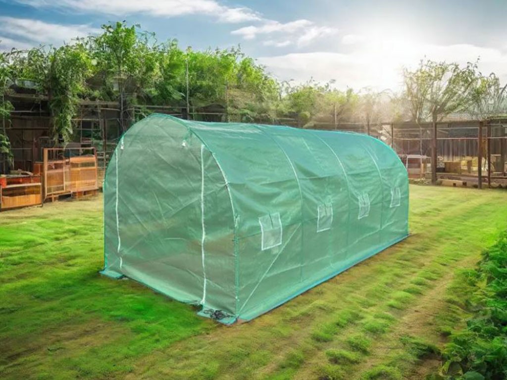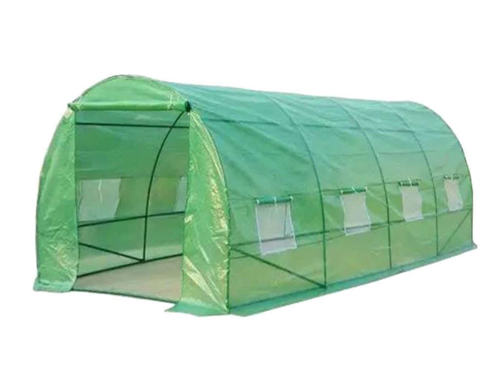Seră din folie pentru creșterea plantelor, folie verde cu o permeabilitate de 140g/m2, fibre de sticlă / polietilenă / metal, tije de construcție cu diametrul de 25mm, 8 ferestre de ventilație pe laterale, suprafață seră din folie de 9 m2, dimensiuni 450x200x200 cm.