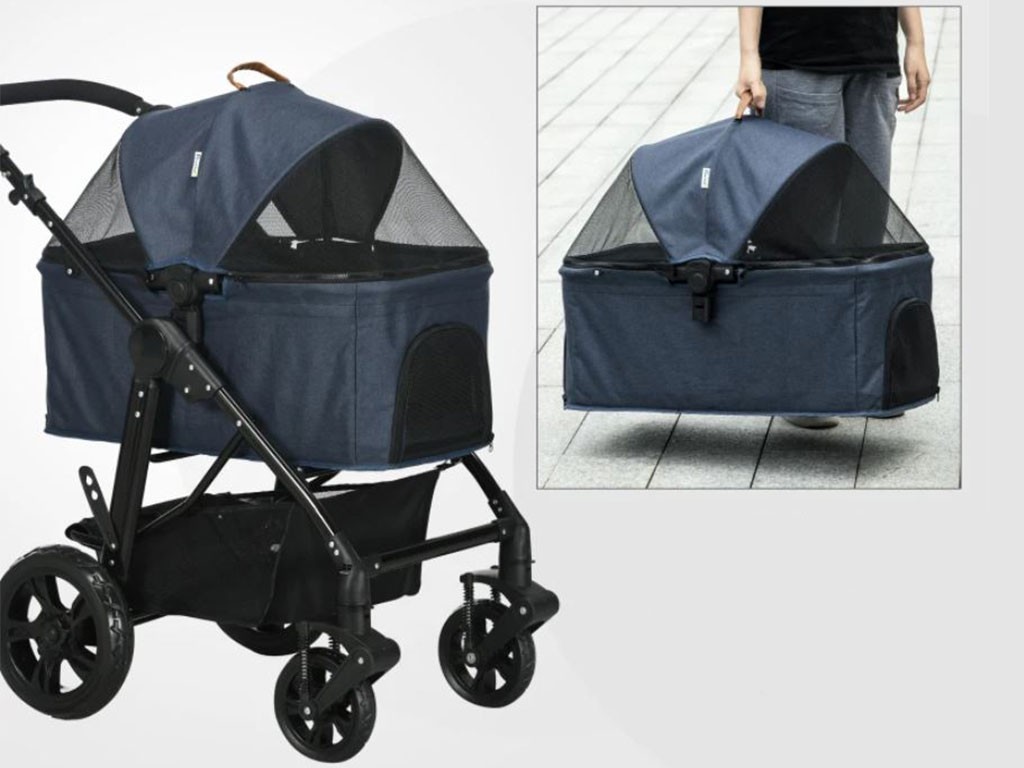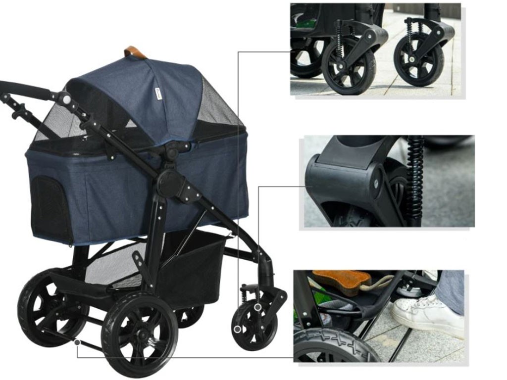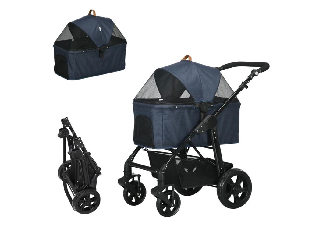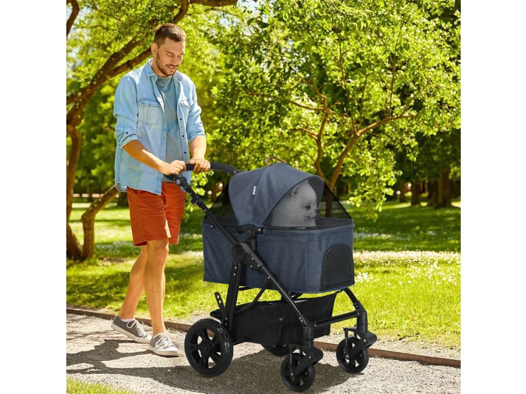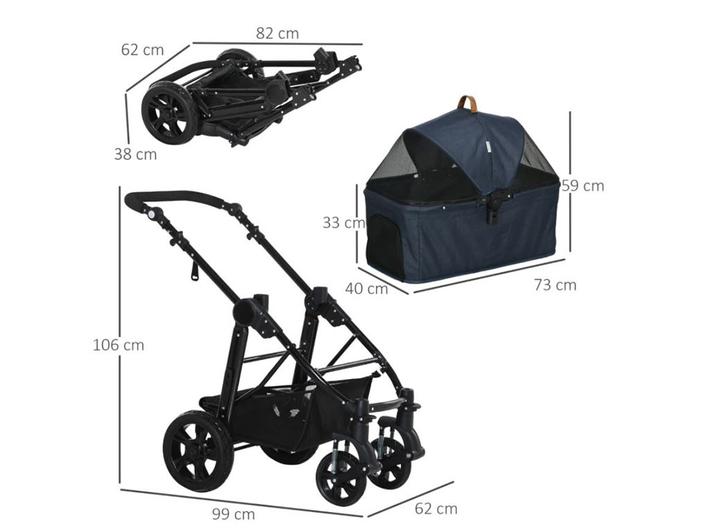 Cărucior 2 în 1 pentru câini de până la 10 kg, disponibil și ca geantă portabilă, mâner reglabil pentru cărucior , cadru din oțel, husă din material Oxford, ferestre din plasă față și spate , copertină pliabilă în 4 etape, ușă cu fermoar din plasă , suprafață de culcare căptușită, 2 lese de siguranță în interiorul coșului, 2 roți față pivotante cu arcuri, 2 roți spate fixe cu frâne, dimensiunile coșului cu copertină 73x40x59cm, dimensiunile interne ale coșului 53x36x20cm, dimensiunile totale ale căruciorului 99x62x106cm.