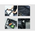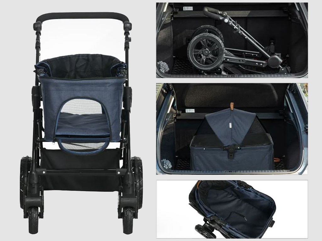 Căruciorul este ușor de depozitat. În câteva momente, puteți plia întregul cărucior și îl puteți depozita sau îl puteți pregăti pentru transportul cu mașina. Coșul poate fi ușor scos din cărucior pentru a crea o geantă portabilă pentru câine, în timp ce cadrul de oțel poate fi pliat. Coșul/geanta pentru câine în sine este, de asemenea, pliabilă. Dacă doriți doar să-i oferiți câinelui dvs. o vizibilitate excelentă în timp ce conduceți, trebuie doar să desfaceți și să deschideți copertina pliabilă în 4 etape.