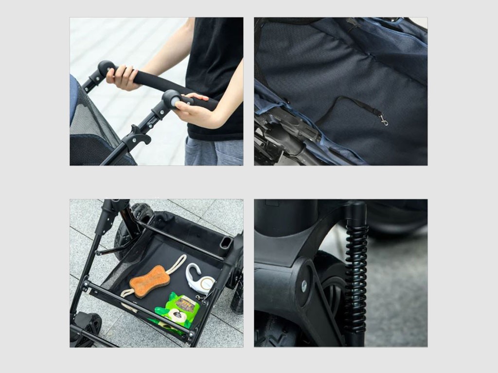 Cu acoperișul pliabil în 4 etape, câinele poate fi ușor blocat în cărucior, iar datorită plasei din față și din spate a copertinei, câinele nu numai că are o vedere bună, dar și o sursă de aer proaspăt. Puteți fixa pur și simplu copertina prin fixarea ei , astfel încât câinele să nu poată sări afară, și puteți, de asemenea, atașa câinele la două lese de siguranță din interiorul căruciorului. Partea inferioară căptușită a căruciorului oferă câinelui un loc confortabil pentru a se întinde în timp ce conduce. În timp ce stă întins, câinele poate observa împrejurimile prin ușa frontală cu fermoar din plasă, care poate fi deschisă. Căruciorul are, de asemenea, suficient spațiu de depozitare pentru echipamentul câinelui. Buzunarul inferior mare de sub corpul căruciorului este folosit pentru a depozita obiecte mai mari, cum ar fi o sticlă de apă, o lesă, o pătură și alte provizii pentru câine.