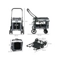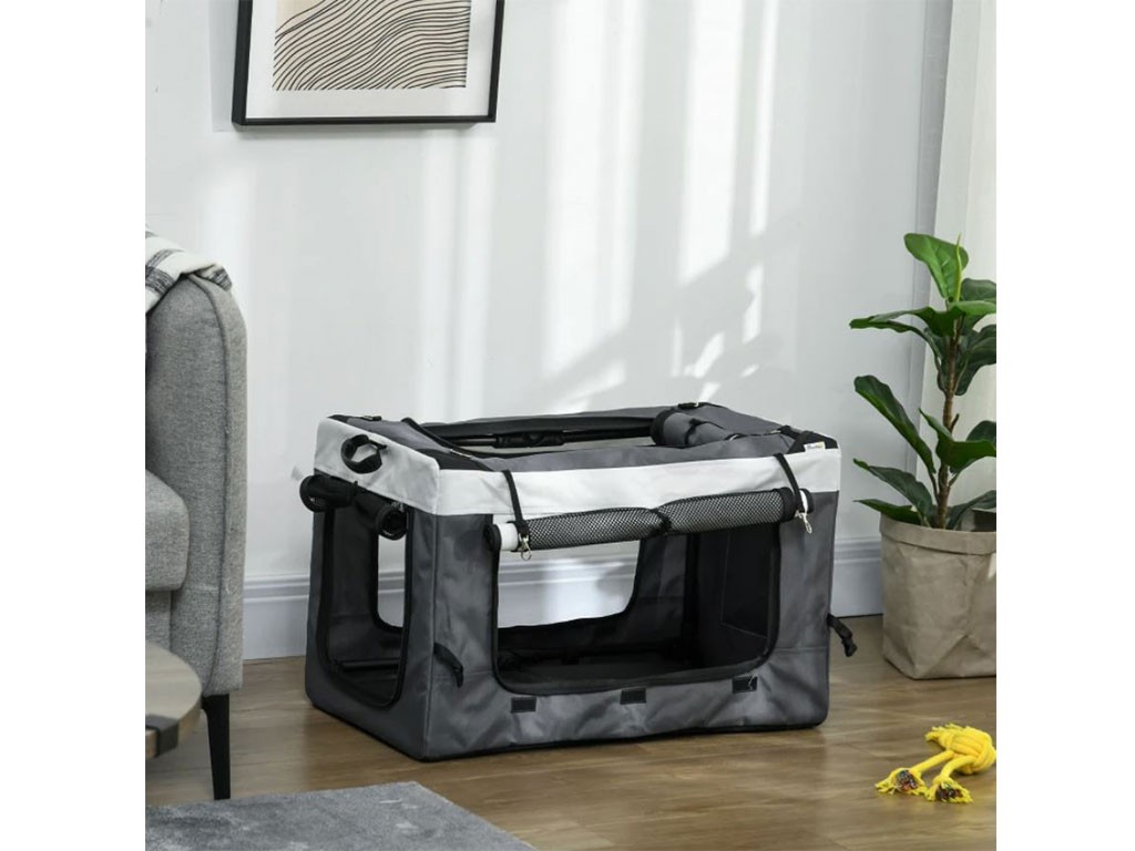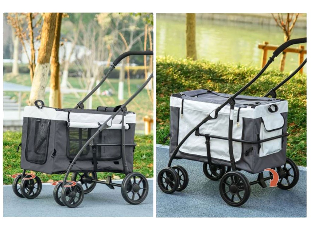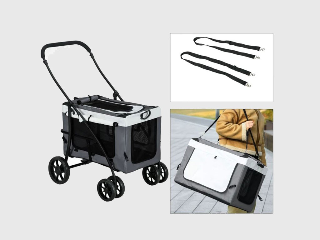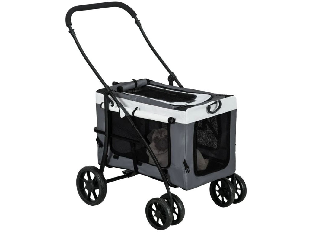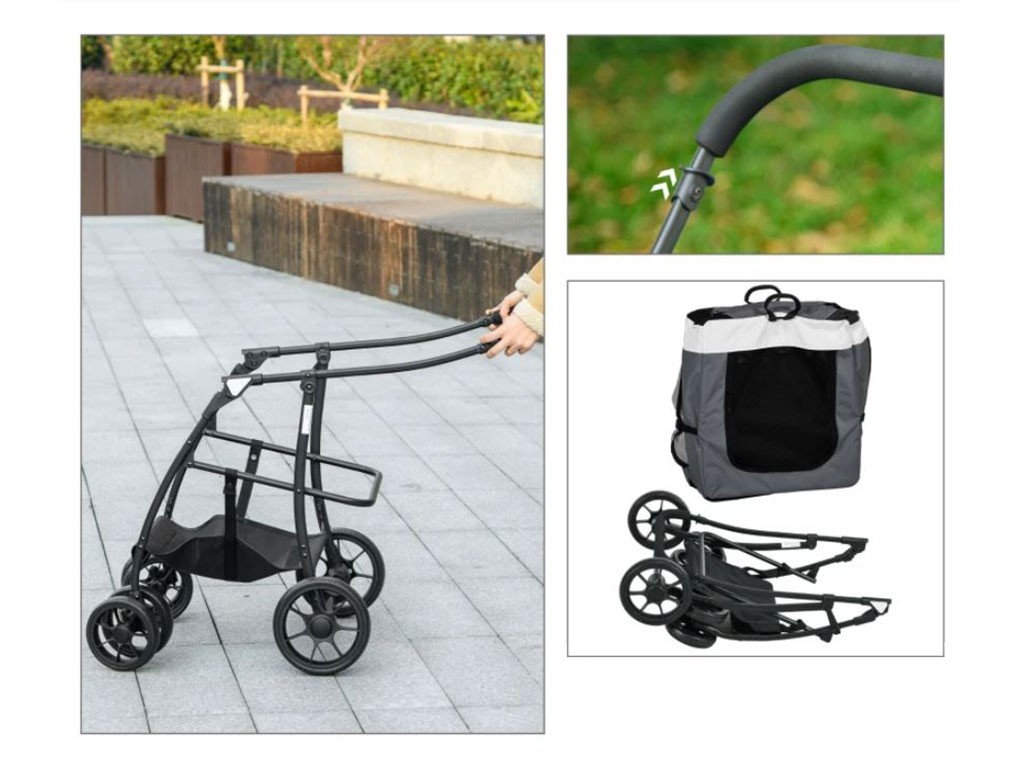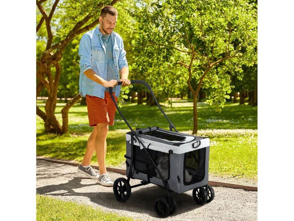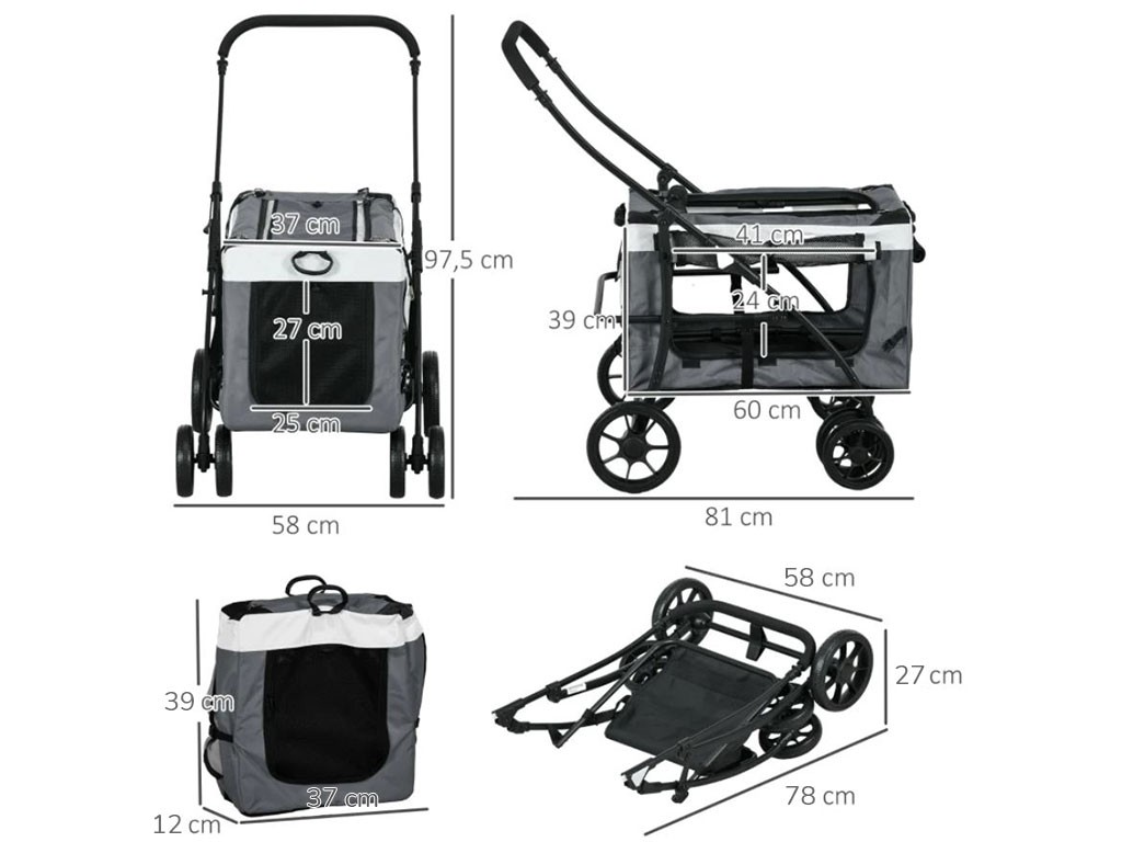 Cărucior 2 în 1 pentru câini de până la 10 kg, disponibil și ca geantă portabilă, cadru din oțel, husă din material Oxford, fereastră superioară din plasă cu fermoar, uși frontale și laterale din plasă cu fermoar , căptușeală confortabilă pentru culcare, 2 mânere și 2 curele pentru transport, buzunar de depozitare pe spate, lesă de siguranță în interior, 2 roți frontale duble pivotante din EVA , 2 roți spate pivotante cu frână, dimensiuni geantă 60x37x39cm, dimensiuni totale cărucior 81x58x97,5cm.