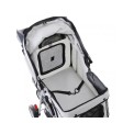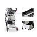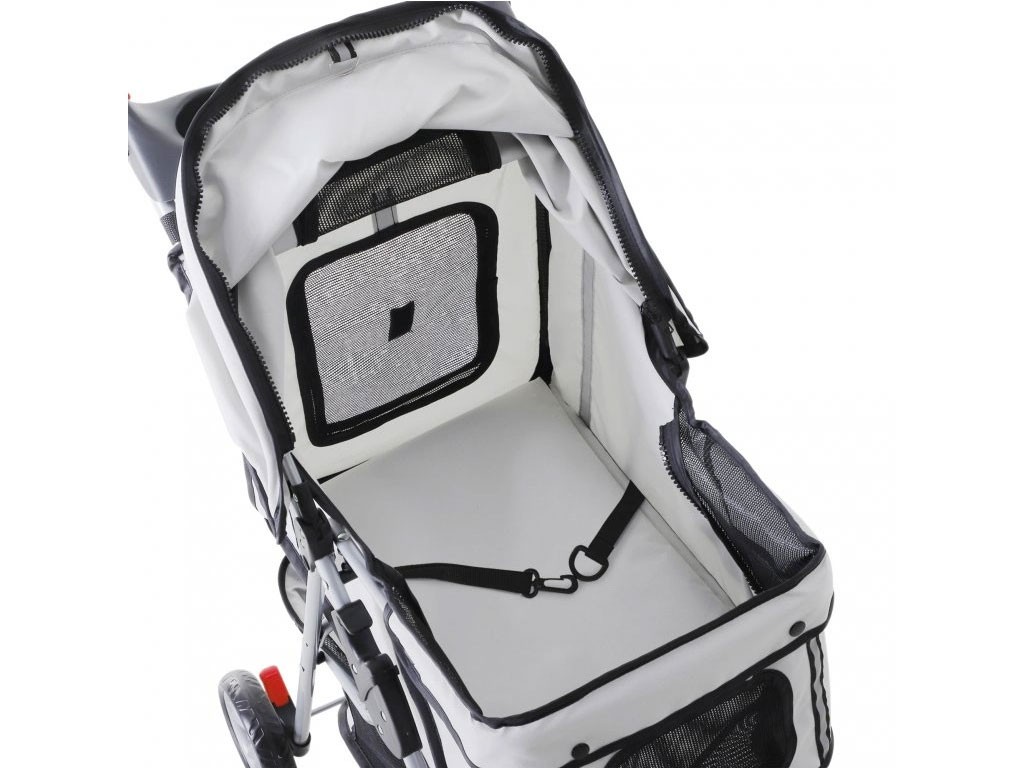 Cu trapă rabatabilă Câinele poate fi ușor blocat în cărucior și, datorită ferestrei mari din plasă din copertină și a ușii din plasă, câinele nu numai că are o vedere bună, dar și o sursă de aer proaspăt. Manipularea câinelui se va face prin Ușile cu fermoar din față și din spate sunt ușor de deschis și puteți apoi atașa câinele la două lese de siguranță din interiorul căruciorului. Căruciorul are, de asemenea, mult spațiu de depozitare pentru echipamentele pentru câini. Buzunarul inferior mare de sub corpul căruciorului este folosit pentru a depozita obiecte mai mari, cum ar fi o sticlă de apă, o lesă, o pătură și alte provizii pentru câini. Buzunarul practic cu fermoar de pe ușa din spate este situat la îndemână pentru obiecte mici, cum ar fi recompense sau documente.