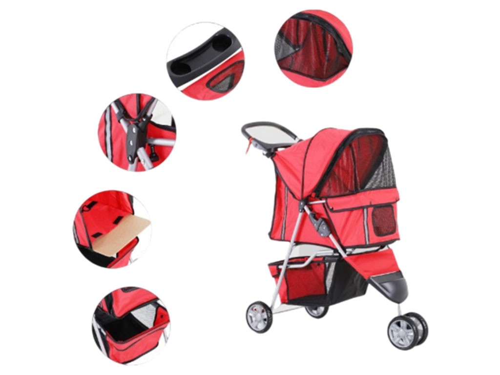 Cărucior pentru câini de până la 10 kg, 2 suporturi pentru biberoane, Cadru din oțel, husă din material Oxford, copertină parasolar pliabilă, ușă frontală din plasă cu fermoar , ușă spate cu geantă cu fermoar, 2 curele de siguranță în interior, roți față duble pivotante, 2 roți spate duble fixe cu frâne, dimensiuni interne cu copertină 55x32x52cm, dimensiuni totale ale căruciorului 75x45x97cm.