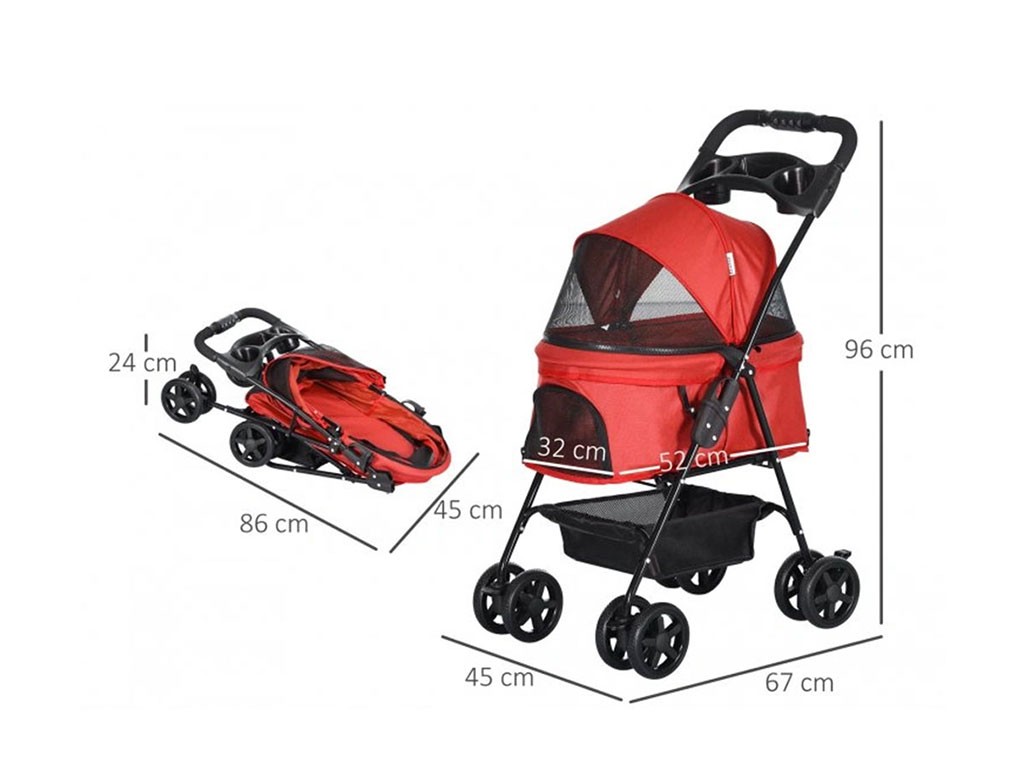 Cărucior pentru câini până la 4 kg, 2 suporturi pentru biberoane, cadru din oțel, husă din material Oxford , copertină solară pliabilă, ușă frontală din plasă cu fermoar , ușă spate cu geantă cu fermoar, 2 lese de siguranță în interior, roți față duble pivotante, 2 roți spate duble fixe cu frâne, dimensiuni interne cu copertină 52x32x48cm, dimensiuni totale ale căruciorului 67x45x96cm.