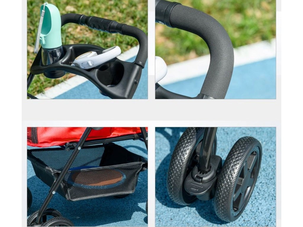 Puteți folosi acest cărucior confortabil pentru câini pentru plimbări în oraș sau în parc. O plimbare plăcută este asigurată de roțile față duble pivotante și roțile spate duble fixe, care pot fi fixate cu două frâne.