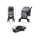 Cu acoperișul pliabil în 4 etape, câinele poate fi ușor blocat în cărucior, iar datorită plasei din față și din spate a copertinei, câinele nu numai că are o vedere bună, dar și o sursă de aer proaspăt. Puteți fixa pur și simplu copertina prin fixarea ei astfel încât câinele să nu poată sări afară și puteți, de asemenea, atașa câinele la două lese de siguranță din interiorul căruciorului. Perna moale a căruciorului oferă câinelui un loc confortabil pentru a se întinde în timp ce conduce. În timp ce stă întins, câinele poate observa împrejurimile prin ușa frontală cu fermoar din plasă, care poate fi deschisă. Căruciorul are, de asemenea, suficient spațiu de depozitare pentru echipamentul câinelui. Buzunarul inferior mare de sub corpul căruciorului este folosit pentru a depozita obiecte mai mari, cum ar fi o sticlă de apă, o lesă, o pătură și alte provizii pentru câine.