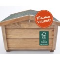 Casa este realizată din lemn masiv de înaltă calitate, vopsită cu o lac ecologic și non-toxic, astfel încât să fie rezistentă la intemperii și să poată rezista la orice vreme. Acoperișul înclinat este acoperit cu o membrană bituminoasă verde, care protejează casa de ploaie și zăpadă. În plus, acoperișul poate fi înșurubat pentru a proteja ariciul de dușmani.