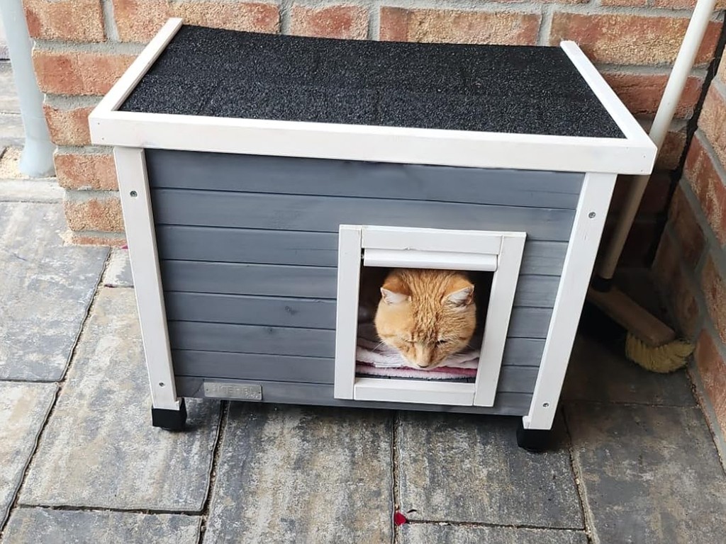 Căsuța din lemn pentru pisici cântărește aproximativ 7 kg. Acoperișul căsuței este acoperit cu un material impermeabil protector. Cu toate acestea, recomandăm amplasarea căsuței sub un baldachin pentru a o proteja de ploaie, zăpadă și lumina directă a soarelui. Căsuța din lemn este tratată la suprafață cu un strat protector de bază. Pentru o durată de viață mai lungă, stratul protector trebuie reînnoit, ca în cazul oricărui tip de lemn.