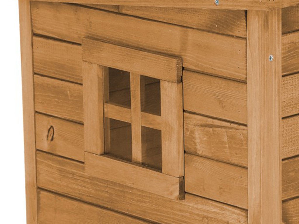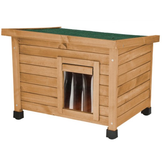 Căsuța din lemn pentru pisici cântărește aproximativ 7 kg. Acoperișul căsuței este acoperit cu un material impermeabil protector. Cu toate acestea, recomandăm amplasarea căsuței sub un baldachin pentru a o proteja de ploaie, zăpadă și lumina directă a soarelui. Căsuța din lemn este tratată la suprafață cu un strat protector de bază. Pentru o durată de viață mai lungă, stratul protector trebuie reînnoit, ca în cazul oricărui tip de lemn.