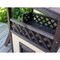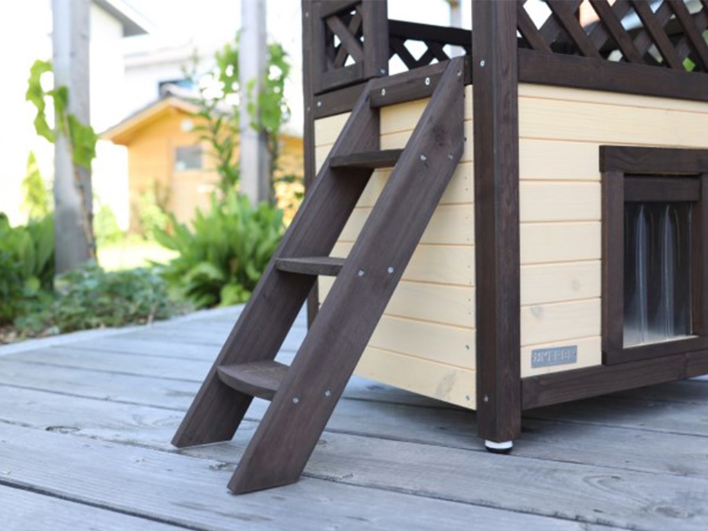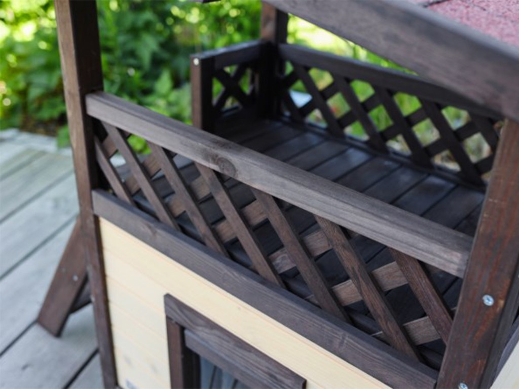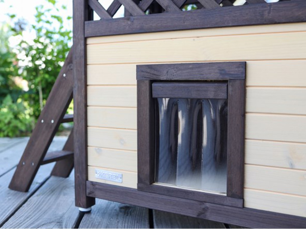 Căsuța pentru pisici oferă un mediu sigur și liniștit pentru pisica ta. Deasupra casei există o terasă acoperită , la care animalele de companie pot accesa cu ușurință prin intermediul unor trepte de lemn . Ușa este prevăzută cu lamele transparente care protejează pisica din interiorul casei de vânt și frig . Sub podeaua căsuței există spațiu pentru o placă de încălzire, care poate fi achiziționată și instalată cu ușurință.