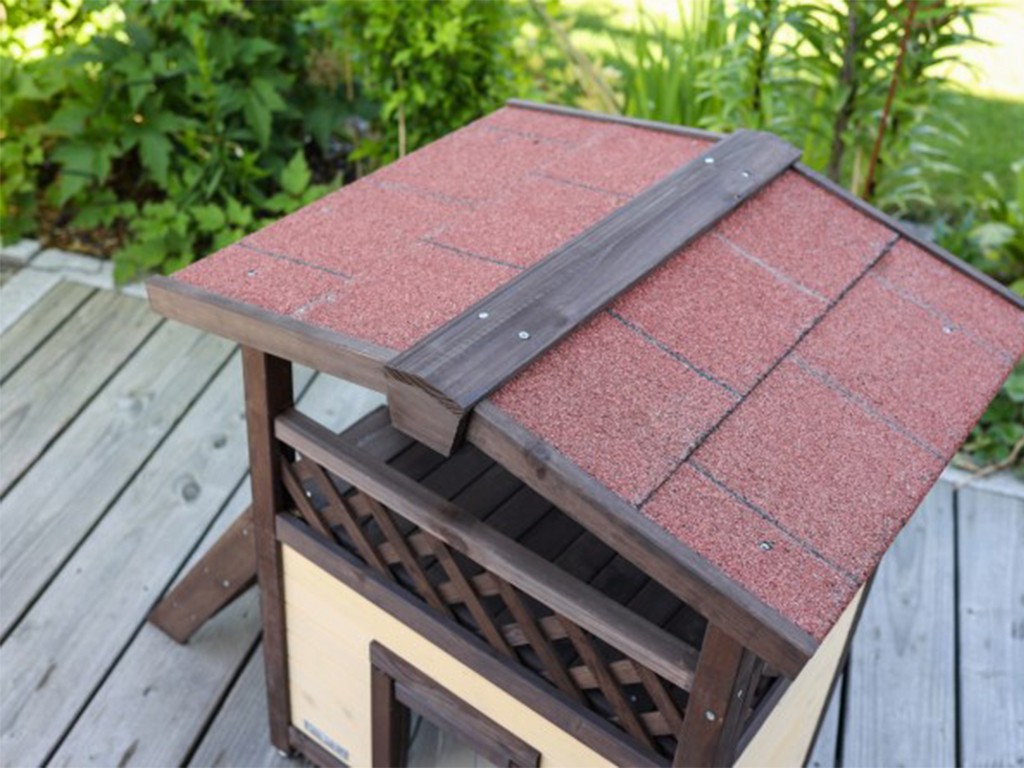 Căsuța din lemn pentru pisici este izolată termic . Izolația este asigurată de pereți dubli umpluți cu polistiren expandat . Acoperișul căsuței este acoperit cu un material bituminos protector impermeabil . Cu toate acestea, recomandăm amplasarea căsuței sub un adăpost pentru a o proteja de ploaie, zăpadă și lumina soarelui. Căsuța din lemn este tratată la suprafață cu un strat protector de bază. Pentru o durată de viață mai lungă, stratul protector trebuie reînnoit, ca în cazul oricărui material din lemn.
