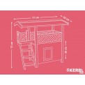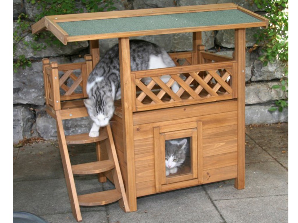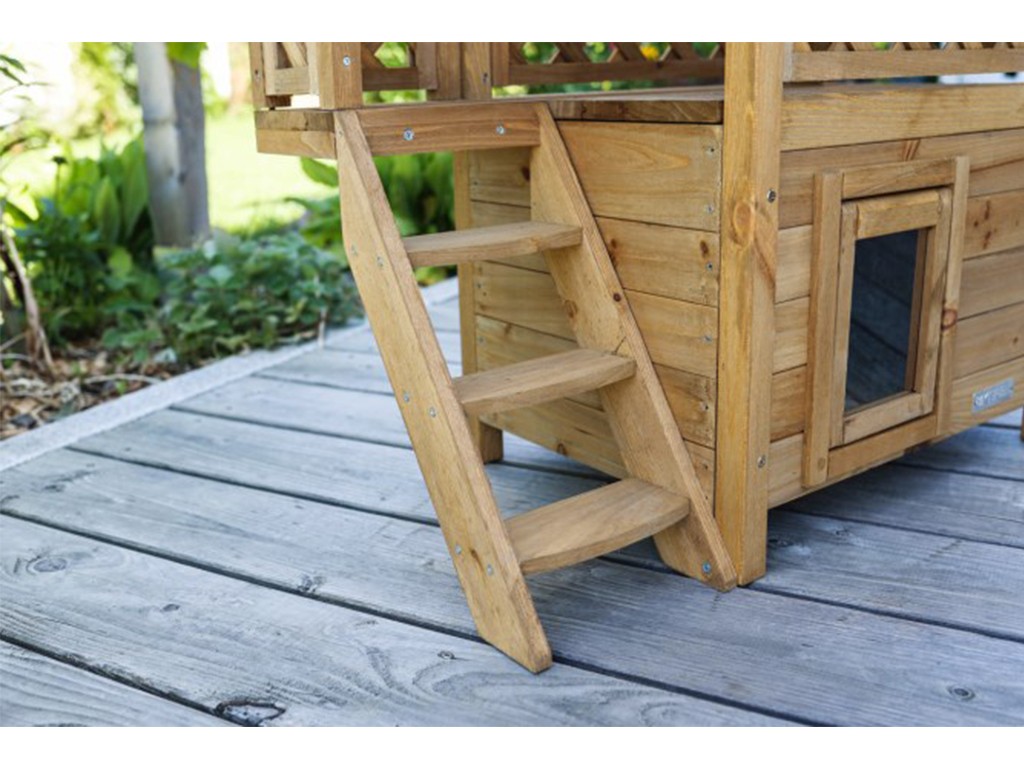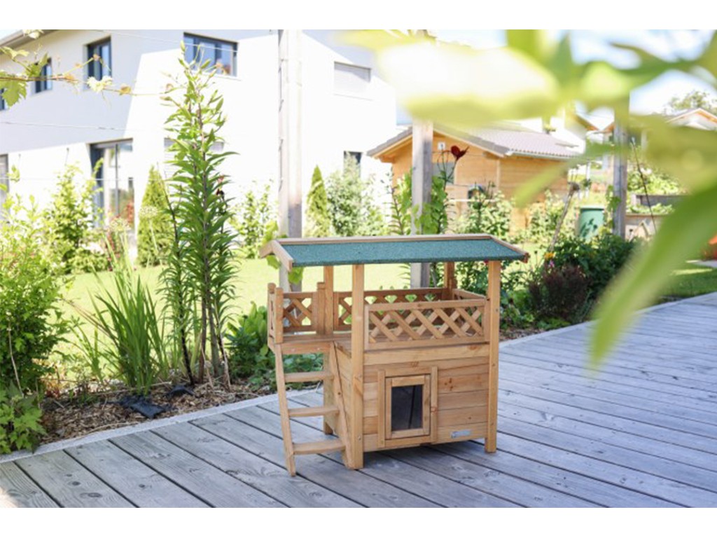 Căsuța pentru pisici, situată la parter, oferă un mediu sigur și liniștit pentru ca animalele de companie să se poată relaxa. Deasupra casei se află o terasă acoperită , la care pisicile pot accesa cu ușurință prin intermediul unor trepte de lemn . Ușa este prevăzută cu o ușă transparentă cu balamale , care protejează pisica din interiorul casei împotriva vântului și a frigului .
