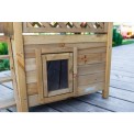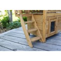Căsuță din lemn pentru pisici, cu dimensiunile de 77 x 50 x 73 cm . Aceasta este o căsuță elegantă pentru pisici , cu terasă, trepte și o ușă transparentă cu balamale, care vă protejează animalul de companie de vânt și frig .