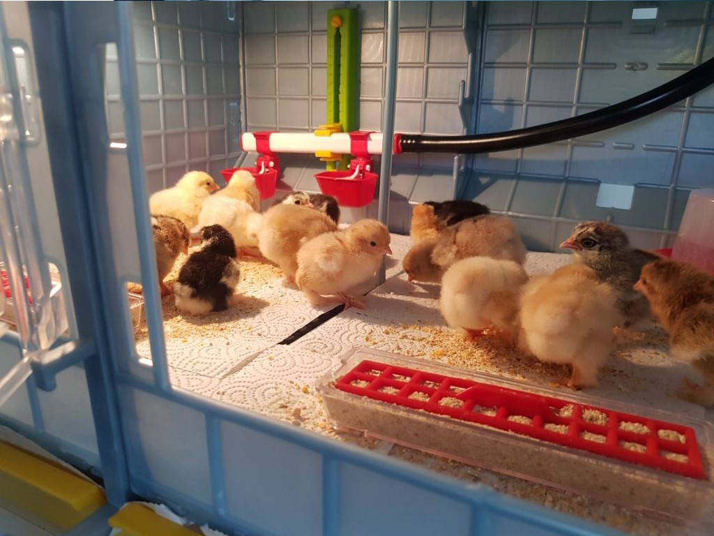 Dimensiunile adăpostului de creștere pliat cu două etaje, inclusiv roți, rezervor de apă, unități de încălzire și hrănitoare, sunt 104 x 64 x 119 cm .