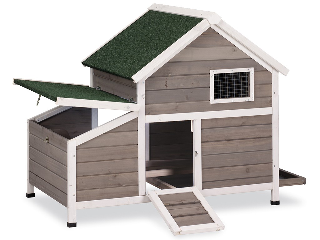 Puteți curăța cu ușurință cotețul de găini în cel mai scurt timp datorită tăvii retractabile pentru bălegar. Curățarea cuibului de ouă nu va fi, de asemenea, o problemă, datorită acoperișului rabatabil.