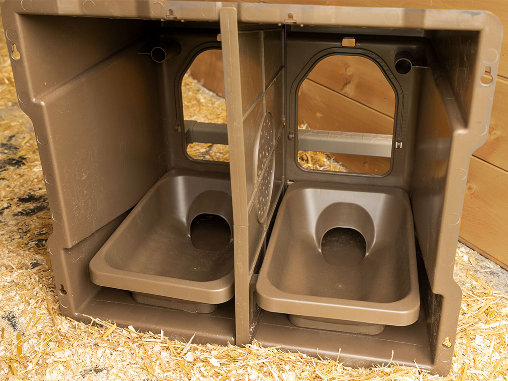 Coșuleț din plastic pentru găini ouătoare , pentru până la 5 găini, pentru confort maxim la depunerea ouălor. Un coș pentru un cuib de ouat, datorită fundului înclinat, ouăle se rostogolesc în siguranță în tavă, curate și nedeteriorate.