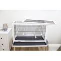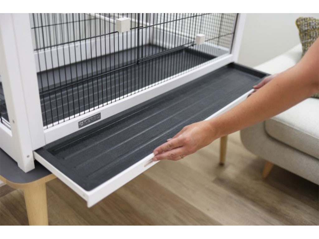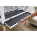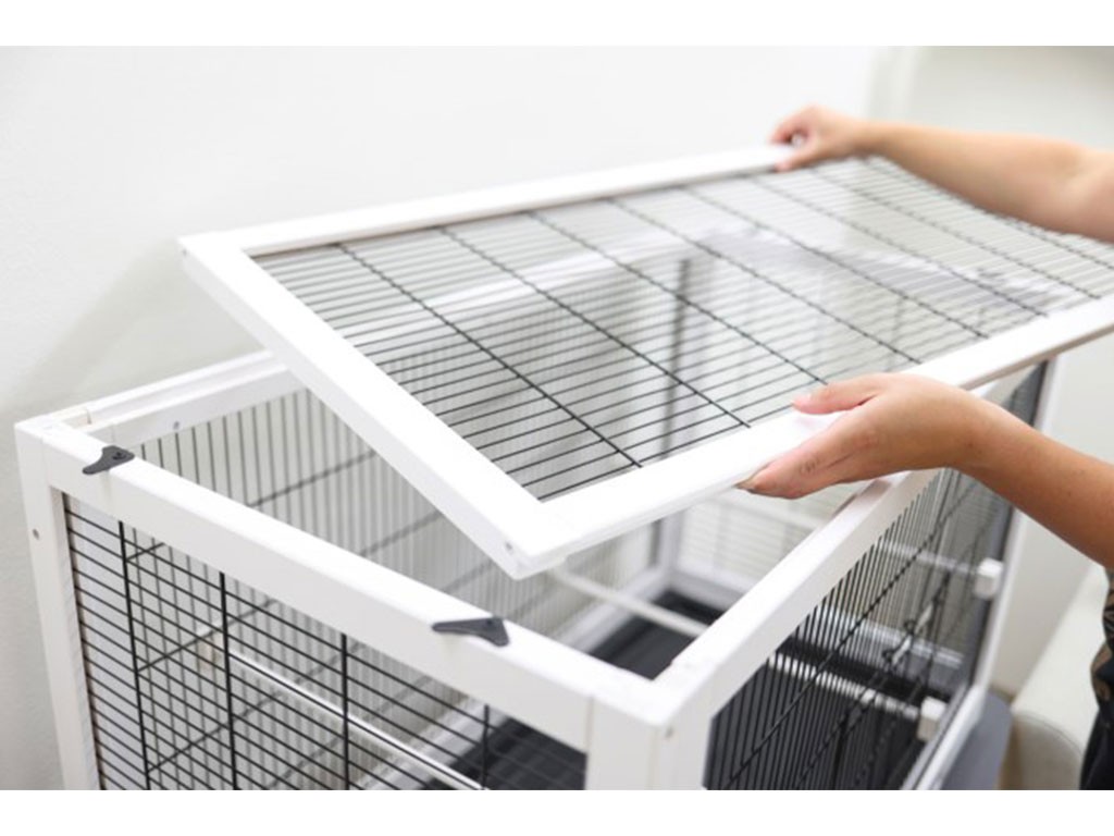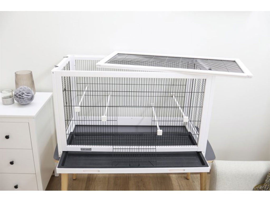 Cușca oferă, de asemenea, ușurință în întreținere, care va fi ușoară și rapidă datorită litierei retractabile și acoperișului detașabil. Litiera are un fund din plastic ușor de curățat și nu absoarbe mirosuri sau lichide. Pur și simplu trageți-o afară, curățați-o și împingeți-o înapoi. Pentru o curățare și mai ușoară, puteți așeza ziare pe litiera (nu este inclusă). Acoperișul detașabil va fi util pentru întreținerea de rutină a cuștii sau la schimbarea apei și a hranei. Pentru ca cușca să reziste și mai mult, vă recomandăm să reînnoiți în mod regulat stratul protector de lemn .
