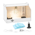 - Set complet de accesorii : Pachetul include un bol de hrănire și o adăpătoare, o lampă de încălzire cu variator de intensitate, iluminare internă și un termometru cu higrometru.