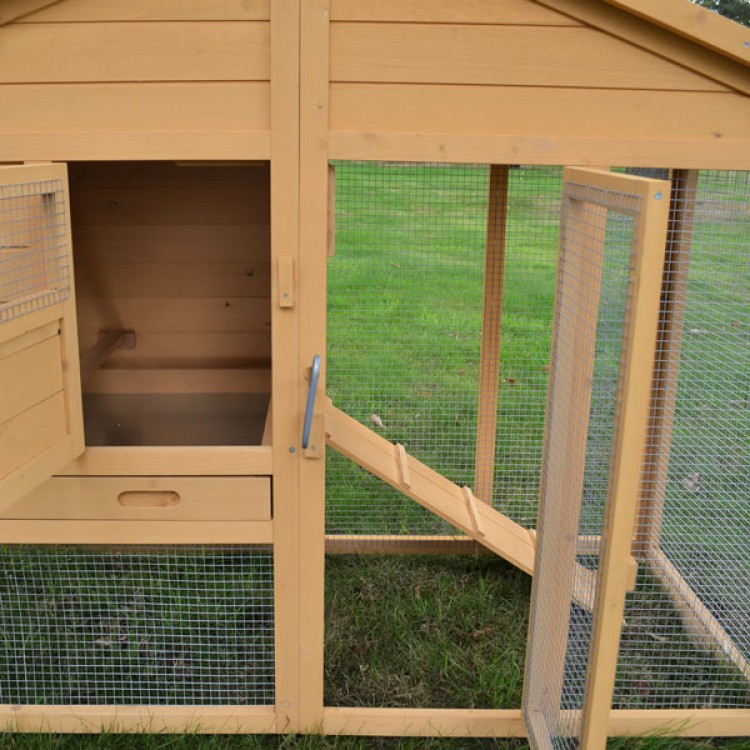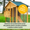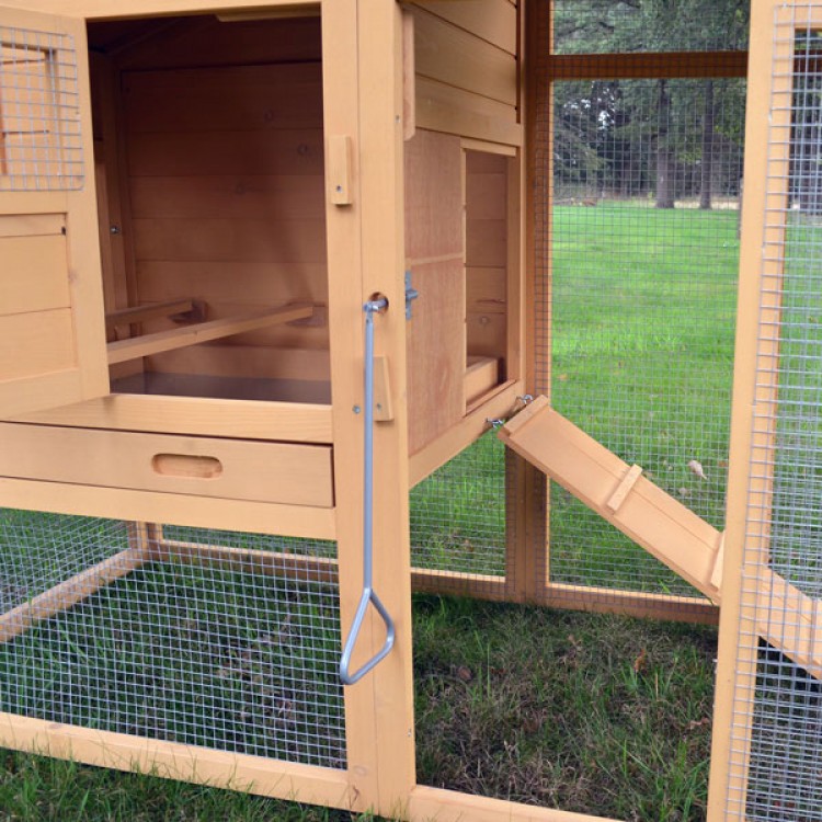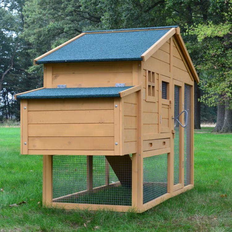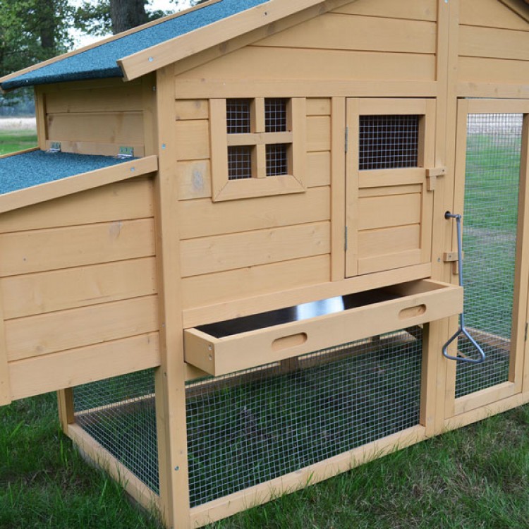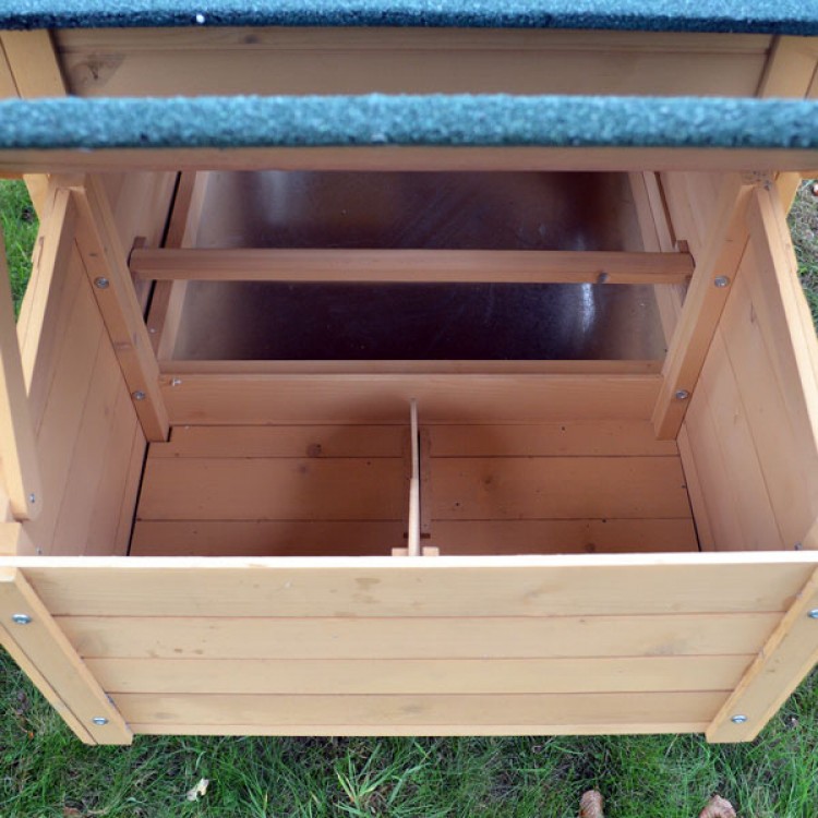Coteț pentru găini este echipat cu două stinghii pentru noapte găini care se odihnesc . Cotețul include și două cuiburi exterioare pentru depunerea ouălor. Colectarea ouălor este foarte simplu pentru că suficient Ridicați pur și simplu acoperișul cuibului. Acoperișul cuibului poate fi fixat deschis cu un băț de lemn.