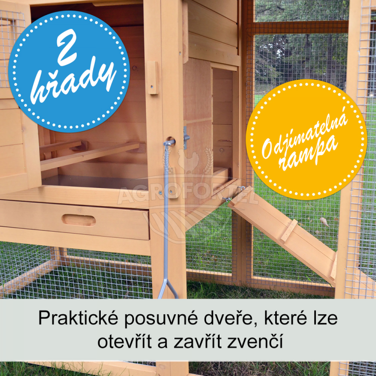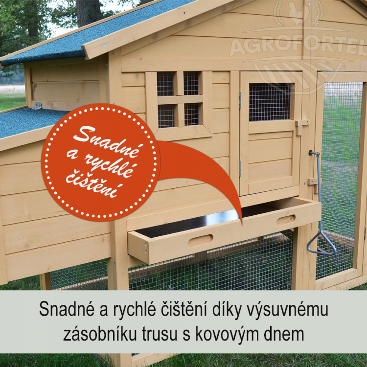 Coteț de găini pentru găini pentru ținerea a 5-6 găini cu dimensiunile de 1900x670x1170 mm de la marca AGROFORTEL . Acesta este un coteț de găini cu țarc, care este echipat cu două stinghii , două cuiburi de ouat în aer liber și o tavă retractabilă galvanizată pentru gunoi de grajd pentru o curățare ușoară. Cotețul de găini este Fabricat din lemn , asigurând o construcție stabilă.