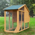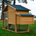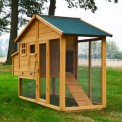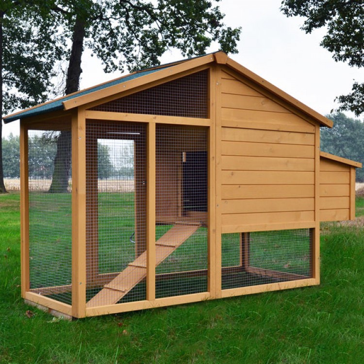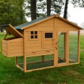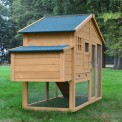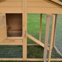 Coteț de găini din lemn și cântărește aproximativ 35 kg. Pentru protecție solară este acoperișul cotețului de pui și cuiburile de ouat sunt acoperite cu benzi de asfalt . Cotețul de găini nu este izolat . Recomandăm amplasarea cotețului sub un adăpost pentru a-l proteja de ploaie, zăpadă și lumina directă a soarelui. Cotețul de găini din lemn este tratat la suprafață cu un strat protector de bază. Pentru o durată de viață mai lungă, stratul protector trebuie reînnoit, ca în cazul oricărui coteț din lemn. Circulația aerului în cotețul de găini este asigurată de o fereastră glisantă frontală .