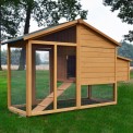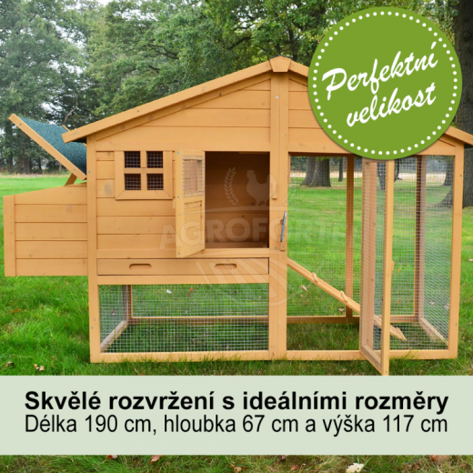 Dimensiunile exterioare ale întregului coteț și țarc sunt 1900x670x1170mm și astfel oferă confort pentru până la 5-6 găini ouătoare clasice.