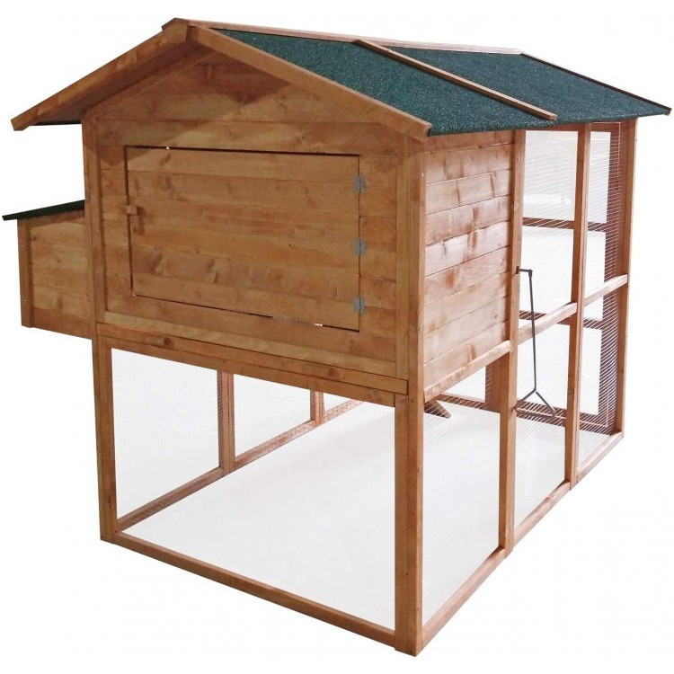 Cotețul de găini cu două etaje, fabricat din lemn de molid, oferă o casă ideală pentru până la 12 găini . Construcția din lemn de înaltă calitate asigură un confort maxim. Cotețul este foarte spațios, iar țarcul este separat de interior printr-o ușă glisantă cu mâner , astfel încât poate fi deschis convenabil din exterior, fără a fi nevoie să intrați în coteț. Cotețul este echipat cu un sertar pentru golirea excrementelor , ceea ce facilitează întreținerea acestuia.