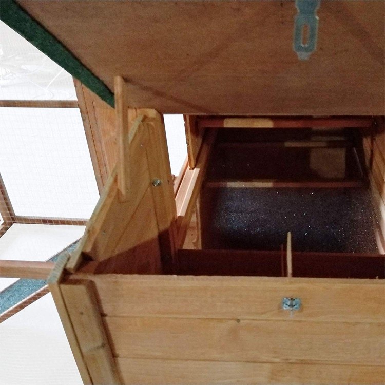 Cotețul pentru găini este foarte spațios, iar țarcul poate fi ușor separat de spațiile interioare folosind uși glisante cu mânere care se deschid din exterior.