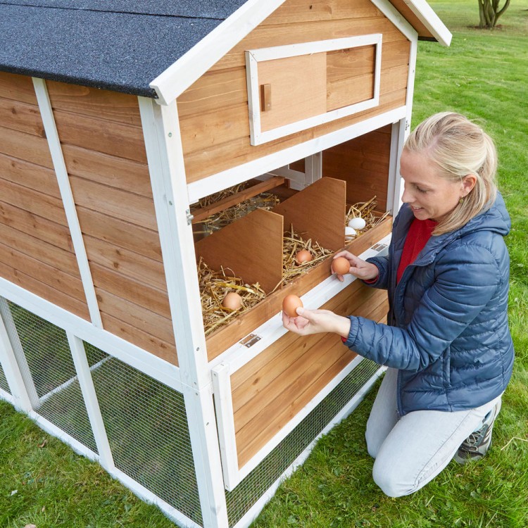 Cotețul Maxi pentru până la 8 găini (în funcție de mărimea lor) conține un cuib triplu . Zona de locuit este conectată la un țarc mare .