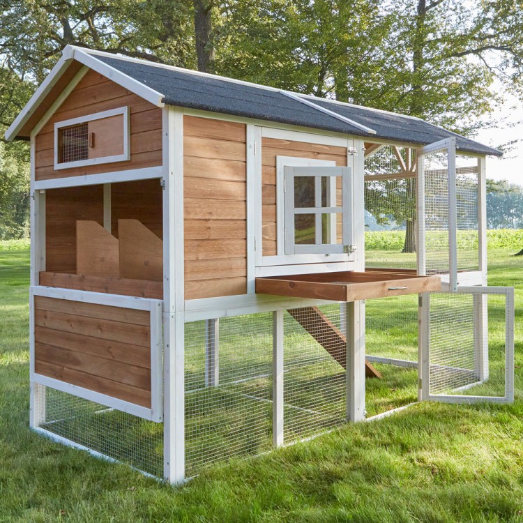Construcția durabilă din lemn masiv asigură un confort deosebit pentru găinile dumneavoastră în coteț. Cotețul este foarte spațios. Țițul este separat de interior printr-o ușă glisantă cu mâner pentru deschidere din exterior fără a deschide cotețul. Asamblarea este simplă datorită instrucțiunilor ilustrate și poate fi realizată de oricine.