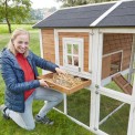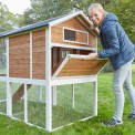 Cotețul pentru găini este foarte spațios, iar țarcul poate fi ușor separat de spațiile interioare folosind uși glisante cu mânere care se deschid din exterior.