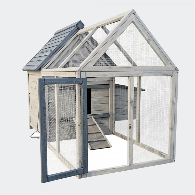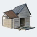 Cotețul pentru găini este foarte spațios, iar țarcul poate fi ușor separat de spațiile interioare folosind uși glisante cu mânere care se deschid din exterior.