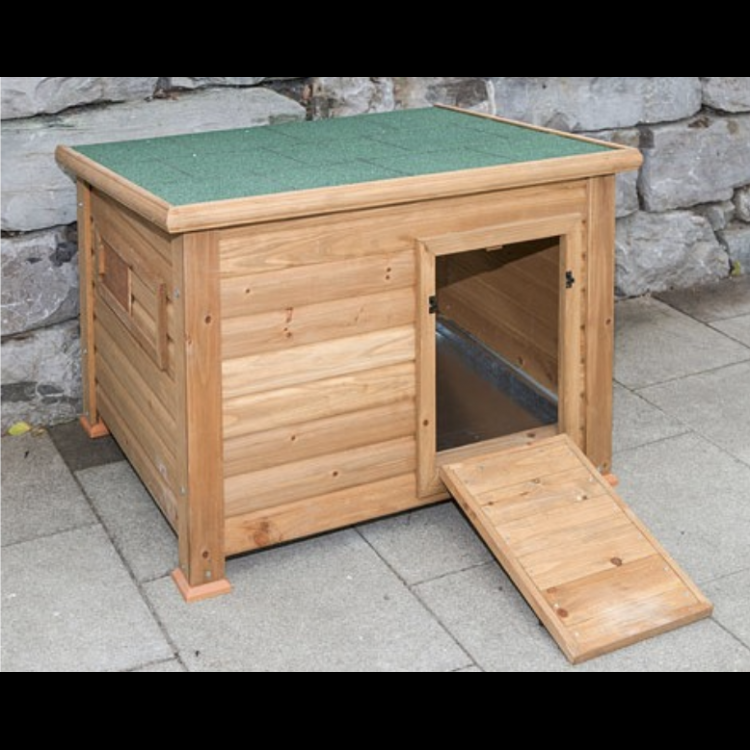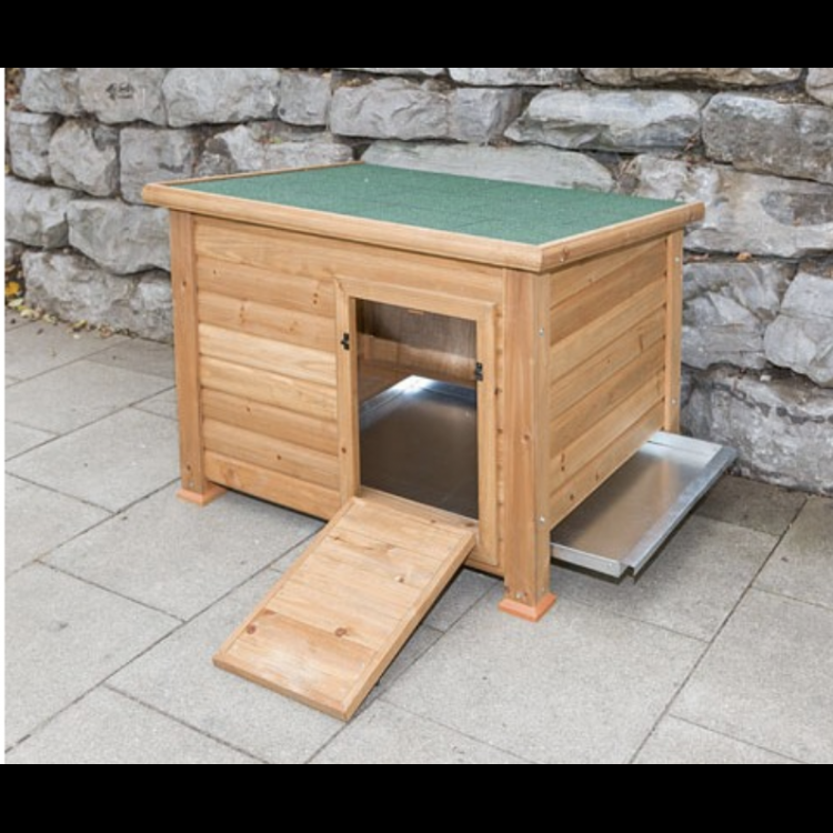 Coteț de găini sau coteț de gâște din lemn. Cotețul are un acoperiș deschizător pentru acces facil pentru curățare. Acoperișul cotețului este făcut din șindrilă.