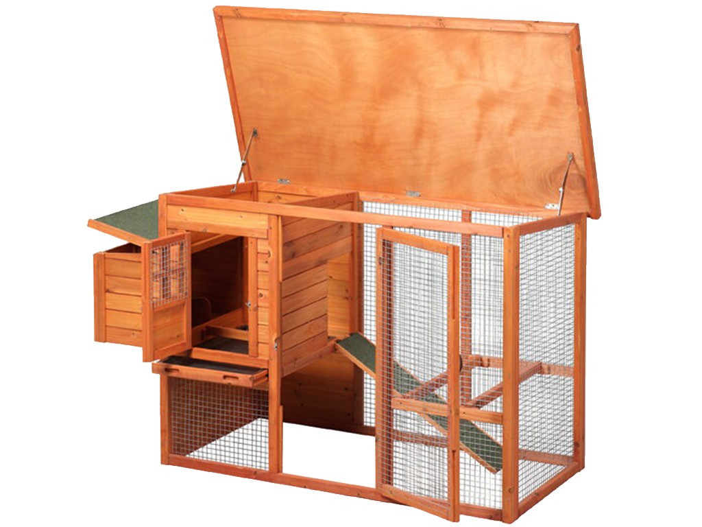 Cotețul de găini este dotat cu stinghii pentru ca găinile să se odihnească noaptea. Cotețul include și două adăposturi exterioare , în care găinile vor avea suficient spațiu și liniște pentru a depune ouă. Luarea ouălor va fi foarte ușoară , deoarece trebuie doar să ridicați acoperișul cuiburilor de ouat pentru a le colecta . În același timp, nu există riscul ca cotețul să aibă scurgeri, deoarece are un acoperiș impermeabil.