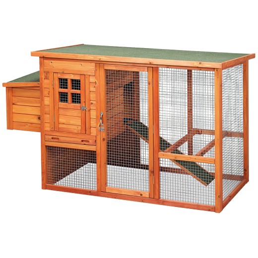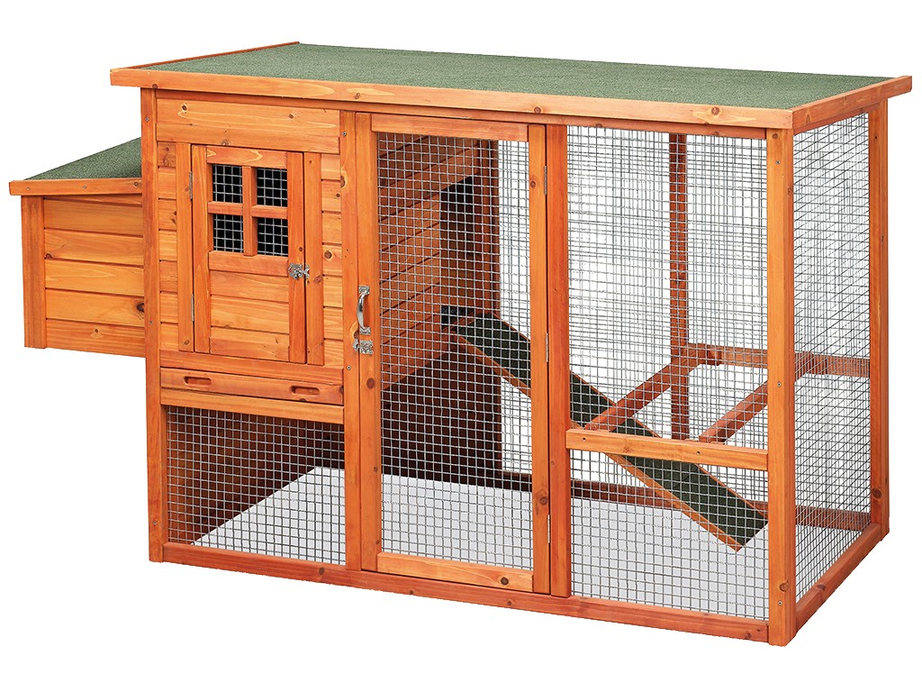 Coteț de găini din lemn cu țarc, pentru 3 - 5 găini ouătoare, din lemn de molid, acoperiș impermeabil, ușă laterală spațioasă cu rampă, fund detașabil pentru curățare ușoară, 2 cuiburi de ouat impermeabile, 2 stinghii exterioare