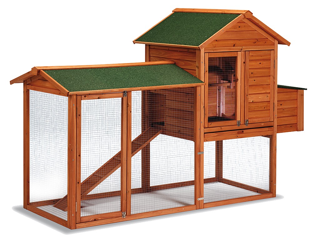 Coteț de găini din lemn cu țarc, pentru 6 - 8 găini ouătoare, fabricat din lemn de molid, acoperiș impermeabil, ușă laterală cu rampă, fund detașabil pentru curățare ușoară, 2 cuiburi de ouat impermeabile , 1 stinghie interioară, ușă dublă frontală mare, dimensiuni 2270x940x1510 mm.