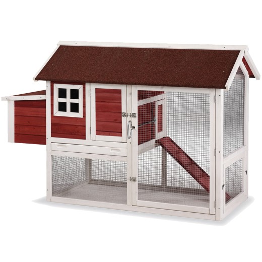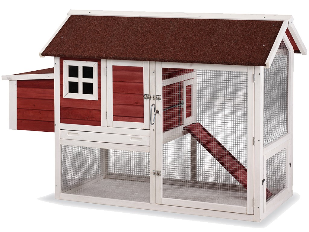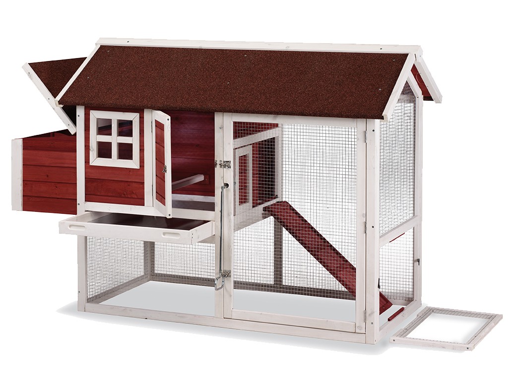 Dimensiunile exterioare ale întregului coteț de găini sunt 1710 x 810 x 1100 mm , și astfel oferă confort pentru 6-8 găini ouătoare clasice . În plus, cotețul este într-o culoare alb-roșie atractivă. Configurația sa generoasă oferă mult spațiu, atât în interiorul cotețului, cât și în țarcul utilizat la maximum pentru găinile ouătoare.