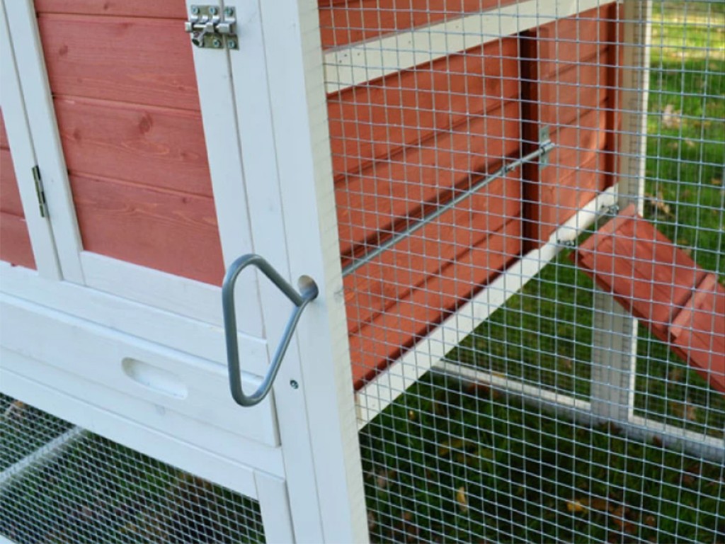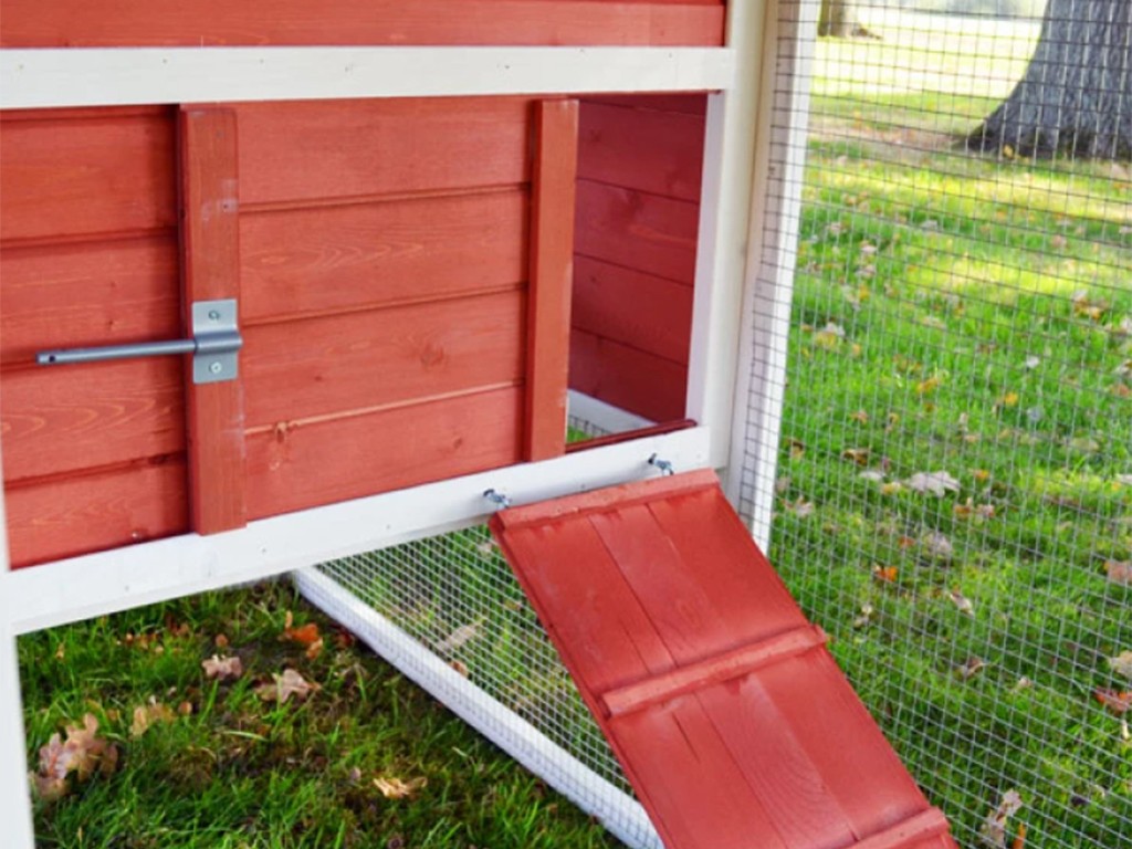 Pentru acces facil, cotețul de găini este echipat cu două uși . O ușă este situată în partea din față a cotețului, cealaltă în lateral, care se închide cu ajutorul unui sistem excelent de mâner exterior, astfel încât nu va trebui să intrați în țarc pentru a deschide și închide găinile din coteț . Țarcul în sine este echipat cu două uși, una mare pentru acces facil la schimbarea hranei și a apei și o ușă mică cu balamale laterale , care este folosită pentru a elibera găinile din țarc.