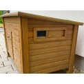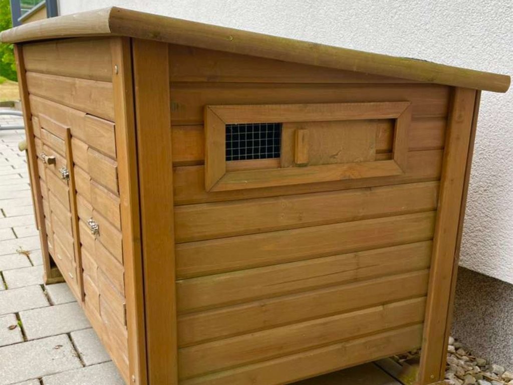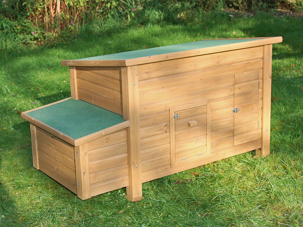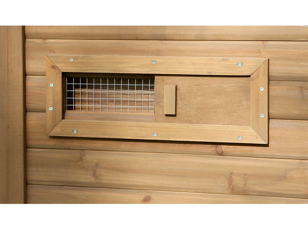 Cotețul de găini din lemn de pin cântărește aproximativ 33 kg, ceea ce asigură o stabilitate excelentă . Pentru a asigura ventilația podelei, cotețul este așezat pe patru picioare ridicate. Cotețul nu este izolat. Pentru a proteja împotriva luminii solare, acoperișul cotețului și al cuiburilor de ouat sunt acoperite cu asfalt . Cu toate acestea, recomandăm amplasarea cotețului sub un adăpost pentru a-l proteja de ploaie, zăpadă și lumina directă a soarelui. Cotețul din lemn este tratat la suprafață cu un strat protector de bază. Pentru o durată de viață mai lungă, stratul protector trebuie reînnoit, ca în cazul oricărui coteț din lemn. Circulația aerului în coteț este asigurată de o fereastră glisantă frontală .