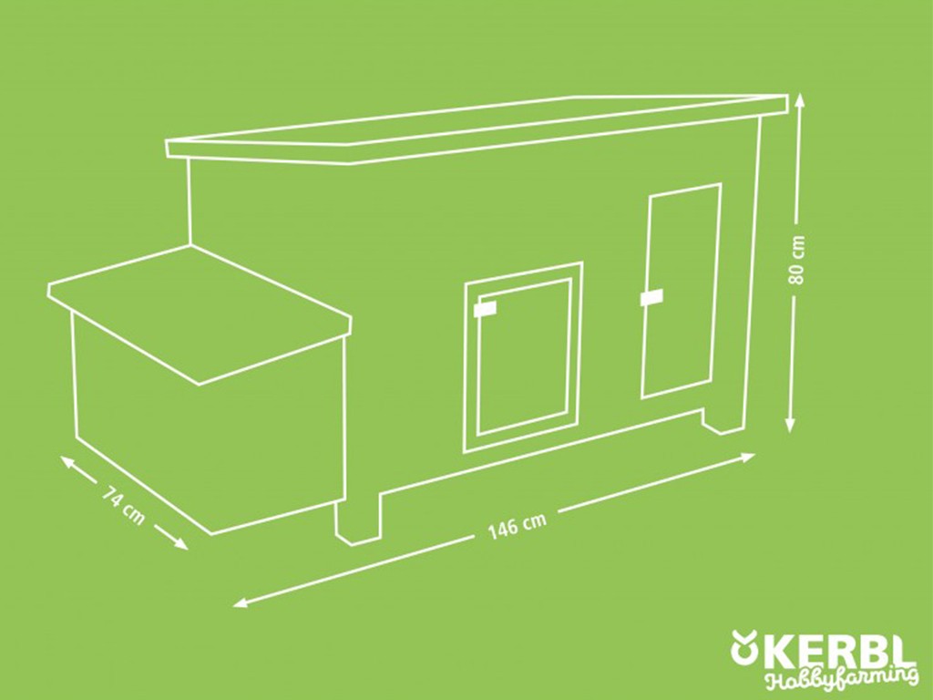 Dimensiunile exterioare ale întregului coteț de găini sunt 146 x 74 x 80 cm , și astfel oferă confort pentru până la 5 găini ouătoare clasice.