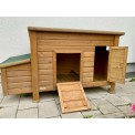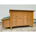 Coteț pentru găini pentru 3-5 găini , cu dimensiunile de 146x74x80 cm. Acesta este un coteț perfect, echipat cu două stinghii , două cuiburi exterioare pentru ouat și un acoperiș rabatabil pentru o curățare ușoară. Cotețul este fabricat din lemn de pin , asigurând astfel o construcție stabilă.